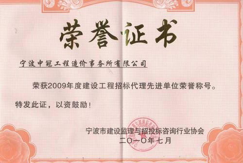 2009年度建設(shè)工程招標(biāo)代理先進(jìn)單位榮譽(yù)稱號