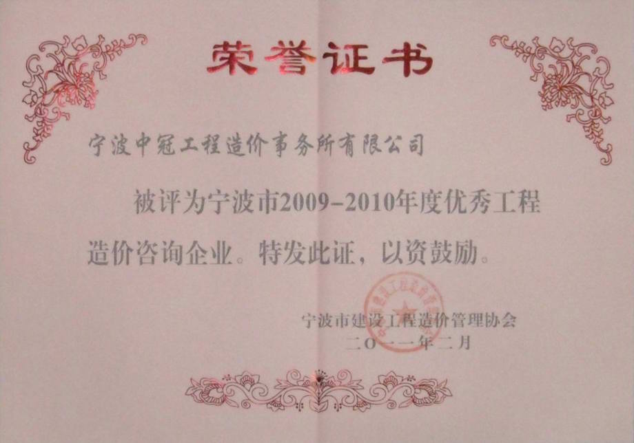 寧波市2009-2010年度優(yōu)秀工程造價咨詢企業(yè)-中冠榮譽-中冠咨詢-中冠工程管理咨詢有限公司