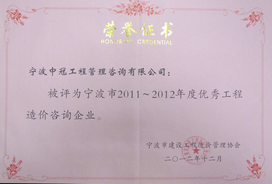 寧波市2011-2012年度優(yōu)秀工程造價咨詢企業(yè)-中冠榮譽(yù)-中冠咨詢-中冠工程管理咨詢有限公司