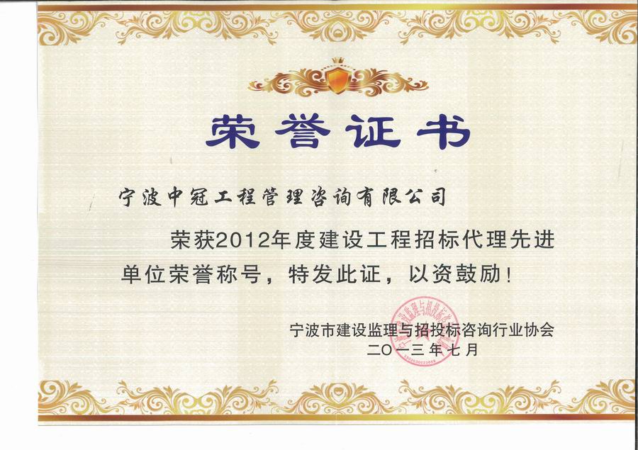 2012年度建設(shè)工程招標(biāo)代理先進(jìn)單位-中冠榮譽(yù)-中冠咨詢-中冠工程管理咨詢有限公司