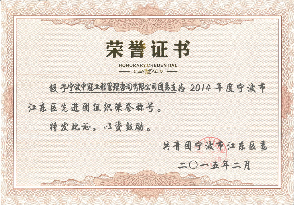 2014年度寧波市江東區(qū)先進團組織榮譽稱號-中冠榮譽-中冠咨詢-中冠工程管理咨詢有限公司