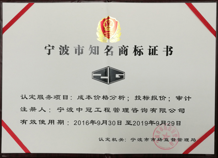 寧波市知名商標(biāo)(本)-中冠榮譽(yù)-中冠咨詢-中冠工程管理咨詢有限公司