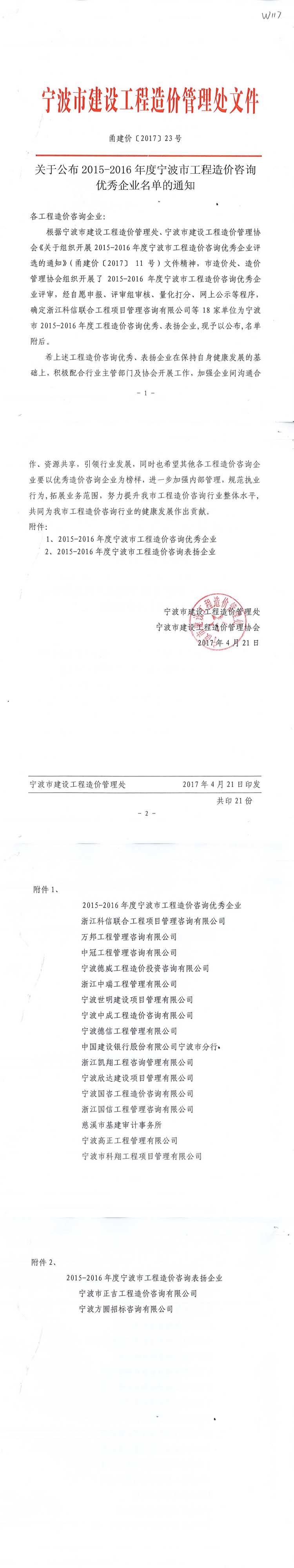 “2015-2016年度寧波市工程造價咨詢優(yōu)秀企業(yè)”榮譽稱號