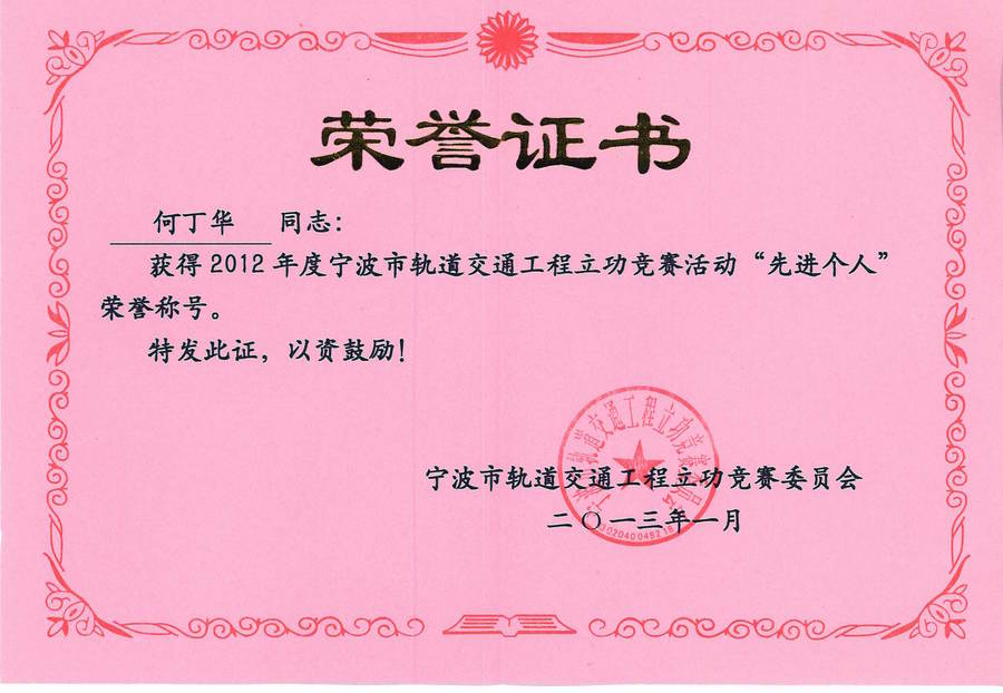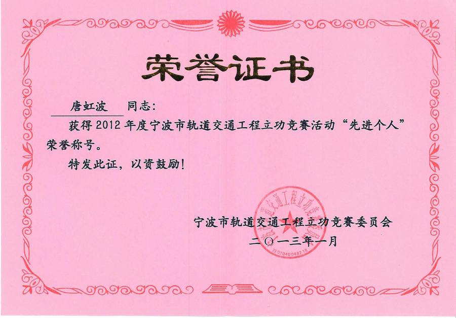 2013年1月喜訊傳來,由寧波市軌道交通工程立功競賽委員會授予中冠公司“2012年度寧波市軌道交通工程立功競賽先進(jìn)集體”,公司唐虹波、何丁華兩位同志授予“先進(jìn)個人”榮譽(yù)稱號。 公司辦公室 二0一三年一月二十三日