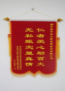 11月20日下午,江東區(qū)百丈街道主任曹敬之一行來我公司,送來一面寫有 “仁者愛心助百丈、無私賑災(zāi)顯真情”的錦旗,感謝我公司在今年抗臺(tái)救災(zāi)期間,向百丈街道捐款。 今年10月,受強(qiáng)臺(tái)風(fēng)“菲特”影響,江東區(qū)百丈街道多處社區(qū)因遭遇暴雨影響,導(dǎo)致社區(qū)內(nèi)涉水嚴(yán)重。我公司在接到街道援助信息后迅速響應(yīng),捐款貳萬元人民幣,為災(zāi)區(qū)送溫暖。