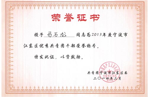 我公司馬萬龍同志于2014年2月,被共青團(tuán)寧波市江東區(qū)委授予2013年度寧波市江東區(qū)優(yōu)秀共青團(tuán)干部榮譽(yù)稱號。