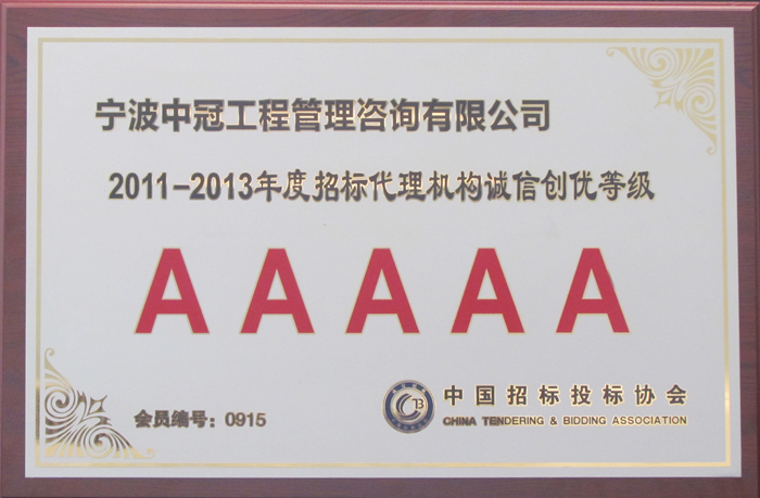 根據(jù)中國招標(biāo)投標(biāo)協(xié)會,近期發(fā)布的《關(guān)于確定2011-2013年度招標(biāo)代理機(jī)構(gòu)誠信創(chuàng)優(yōu)等級的決定》,我公司被授予“5A級2011-2013年度招標(biāo)代理機(jī)構(gòu)誠信創(chuàng)優(yōu)”榮譽(yù)。