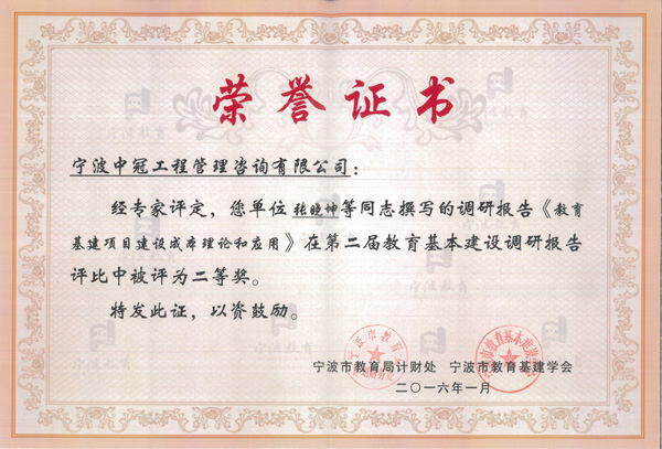 根據(jù)寧波市教育局計(jì)財(cái)處、寧波市教育基建學(xué)會(huì),近期發(fā)布的《關(guān)于公布第二屆教育基本建設(shè)調(diào)研報(bào)告評(píng)比結(jié)果的通知》,我公司張曉坤撰寫的調(diào)研報(bào)告《教育基建項(xiàng)目建設(shè)成本理論和應(yīng)用》在第二屆教育基本建設(shè)調(diào)研報(bào)告評(píng)比中榮獲二等獎(jiǎng)