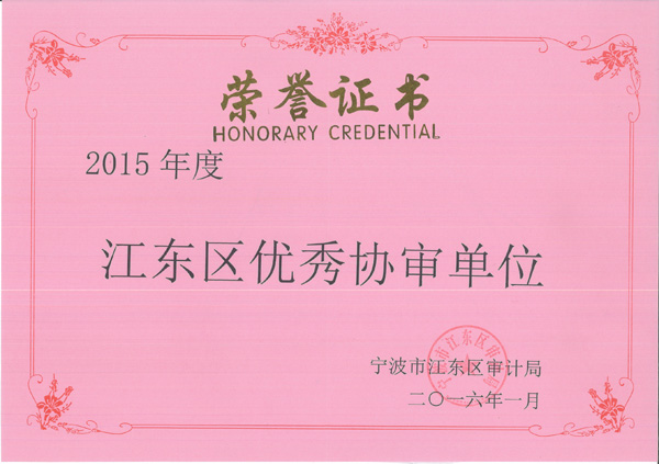 根據(jù)寧波市江東區(qū)審計(jì)局,近期發(fā)布的《關(guān)于表彰江東區(qū)2015年度優(yōu)秀協(xié)審單位和優(yōu)秀協(xié)審人員的通報(bào)》,我公司被評(píng)選為2015年度江東區(qū)優(yōu)秀協(xié)審單位。
