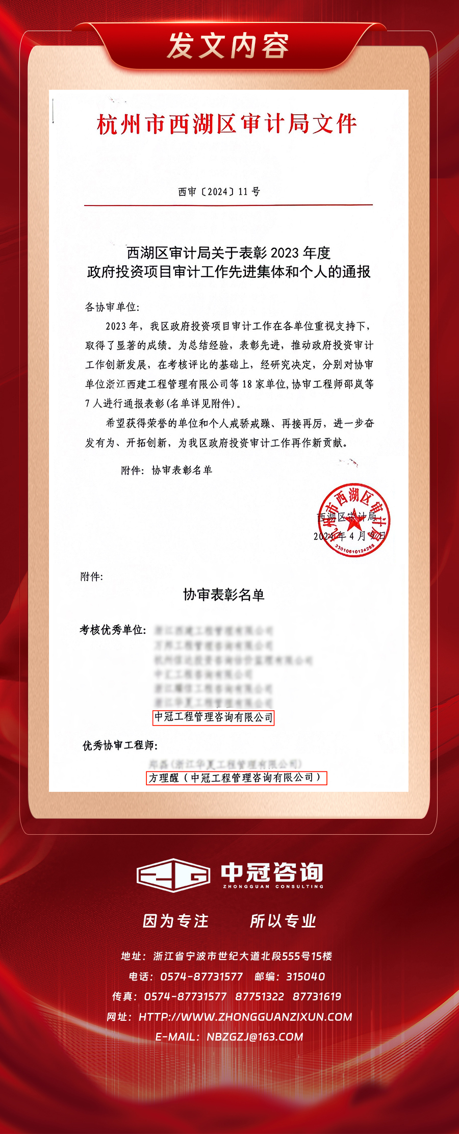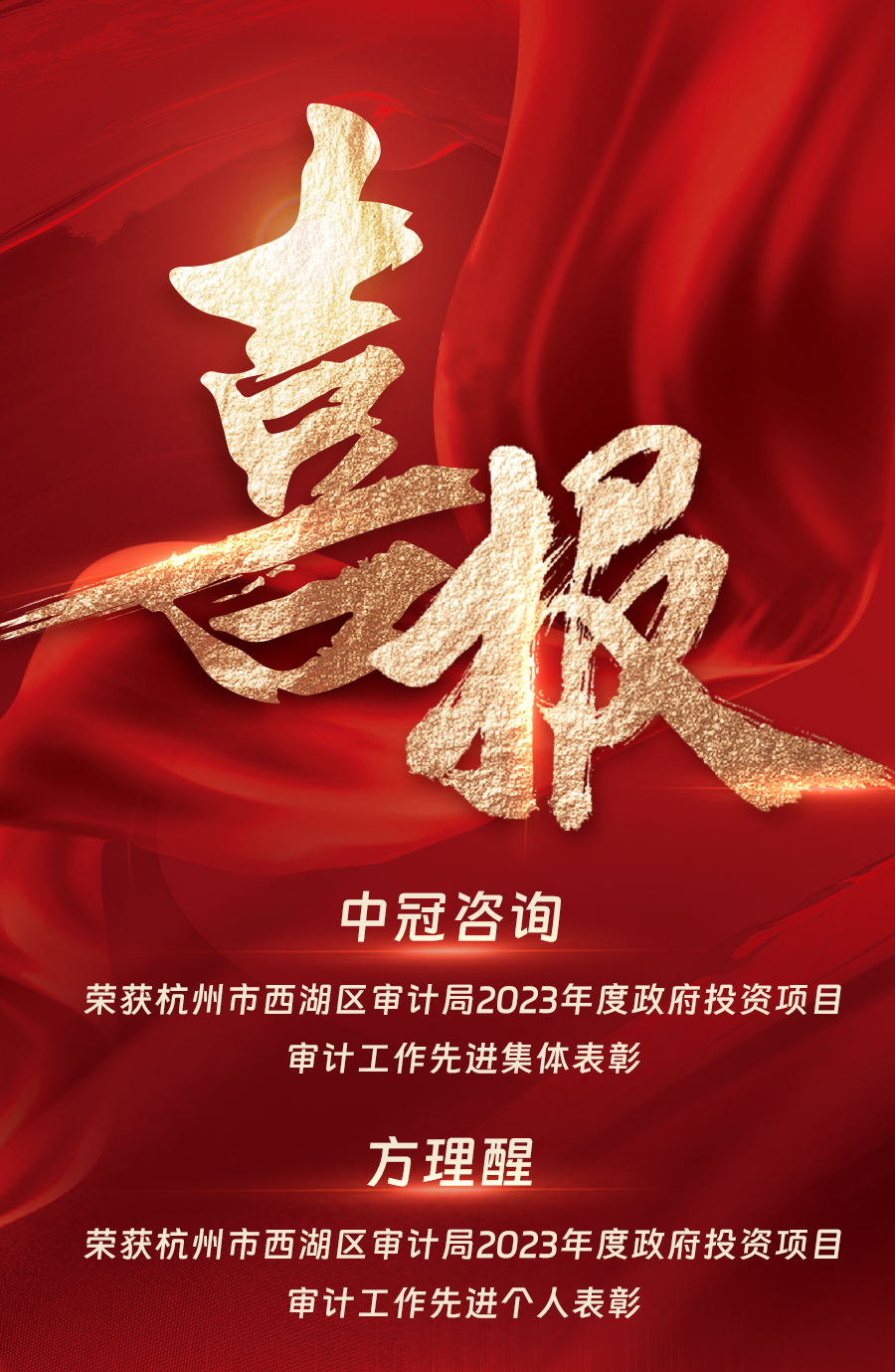 中冠喜報(bào) | 我司榮獲杭州市西湖區(qū)審計(jì)局2023年度政府投資項(xiàng)目審計(jì)工作先進(jìn)集體和個(gè)人表彰-中冠新聞-中冠咨詢-中冠工程管理咨詢有限公司