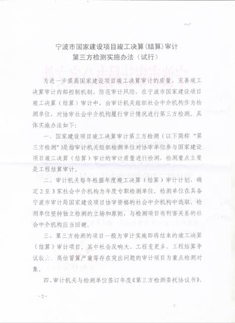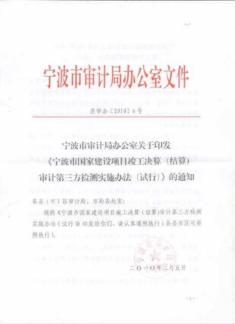 寧波市審計(jì)局辦公室關(guān)于印發(fā)《寧波市國(guó)家建設(shè)項(xiàng)目竣工決算(結(jié)算)審計(jì)第三方檢測(cè)實(shí)施辦法(試行)》的通知